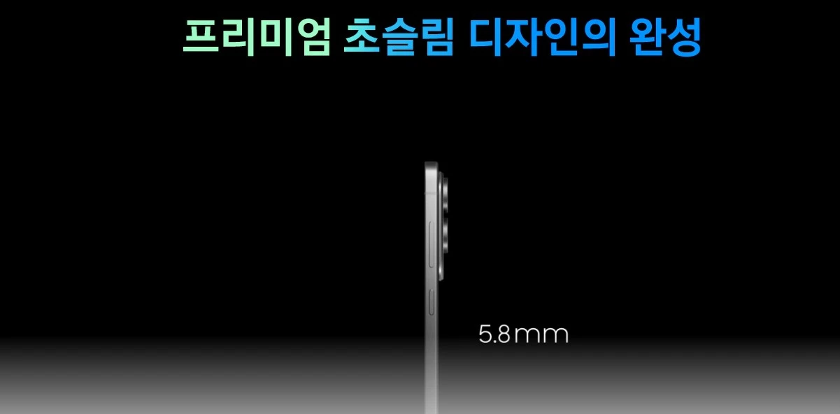 무려 5.8mm의 두께는 현재 출시된 스마트폰 중에서도 가장 얇은 축에 속하며, 이는 사용자가 손에 쥐었을 때 느끼는 가벼움과 슬림함을 극대화시켜줍니다.특히 슬림함을 유지하면서도 내구성을 확보하기 위해 티타늄 프레임이 적용되어 있으며, 측면 엣지 라인은 부드러운 곡선으로 처리되어 한 손 조작성도 우수합니다.